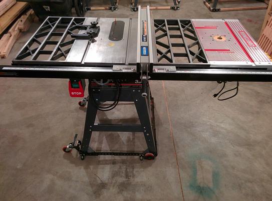 The aluminum fence operates between front and rear rails and provides a 30 rip capacity.